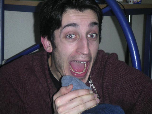 Généralement, Manu a faim vers 1H du matin... Et là, on était tous chez Idriss et il n'y avait plus rien à manger... Manu a commencé à faire des crises d'angoisse en répétant "Manger, MANGER, JE DOIS MANGER !". En plaisantant, Audrey a dit "Tu connais le fameux dicton : si t'as faim, mange un pied et garde l'autre pour demain"... Elle aurait mieux fait de se taire ! Manu s'est exécuté... On a dû lui sauter dessus à quatre pour l'empêcher de manger son pied... Quelle soirée mes aïeux ! |