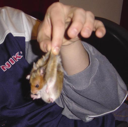 Alors ça, c'est le hamster d'un des colocs de mon beau-frère... Et cette petite chose est pleine de surprises... Ils s'amusent (les bourreaux) à lui faire faire des saltos, à le propulser dans les airs (Evil Kanivel Style), ils lui font faire des numéros d'équilibristes... Et là, c'est une photo de ce meugnon petit animal, et elle me fait marrer ! En fait, on dirait que c'est le même processus qu'Idriss : un gros hamster devenu mince mais avec de la peau en rab' ! |