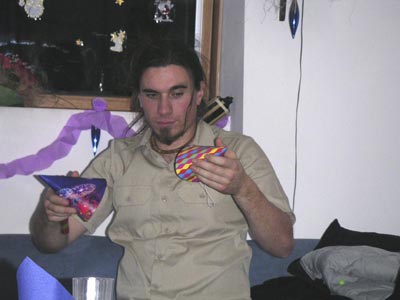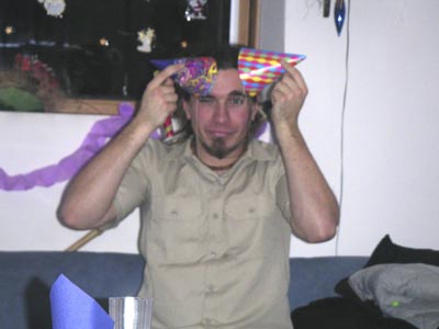 J'adore ces photos. Sur la première, nous sommes en présence d'un Thibo qui se demande bien quelle connerie il pourrait faire avec ses chapeaux. Sur la deuxième photo, on voit bien qu'il a trouvé quoi faire avec ces chapeaux, mais on voit bien aussi que, ben voilà quoi, je le fais, mais bon, c'est naze. |