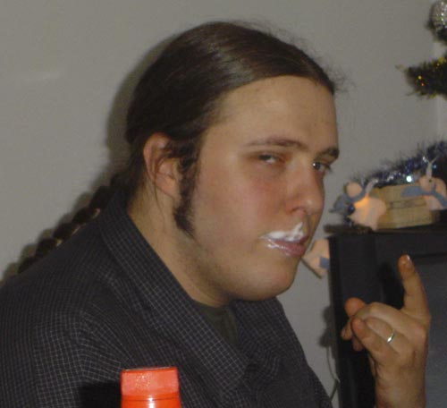 Ben après le saumon, la crême fraîche. A la base, c'était pas fait pour être marrant, mais bon... Manu, qui était à côté de moi, riait à chaudes larmes (et il en rit encore d'ailleurs), alors j'ai pris la pause et le spécial regard de velours. Et voilà. Un couillon avec de la crème sur le gueule... |