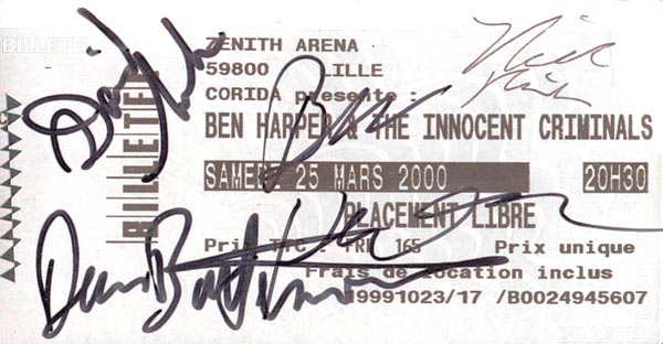 Ma place dédicacée par tous les membres du groupe, sauf le bassiste qui souffrait d'une rage de dents. J'étais comme un gamin devant Ben Harper... et lui était très simple, il ne se prenait pas la tête. Un vrai bonheur.