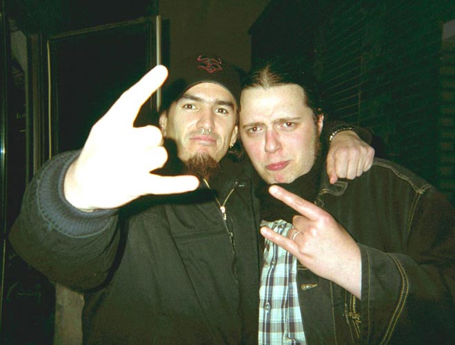 Que dire ? Contrairement à ce que j'ai pu lire dans certains forums comme quoi Robb Flynn est un connard qui ne prend pas le temps de venir saluer ses fans, Robb s'est montré très cool avec nous. Il a pris le temps de signer tout ce qu'il y avait à signer, il a accepté de poser pour toutes les photos (la meilleure preuve de sa COOLiscience est le fait que je n'ai pas une, mais deux photos avec lui, le mec tranquille quoi !). Je tiens à préciser que, quand on me connait, on pourrait croire que Robb est aussi grand que moi... C'est faux, archifaux. Disons qu'il s'est appuyé lourdement sur mon épaule pour que j'arrive à sa hauteur... |